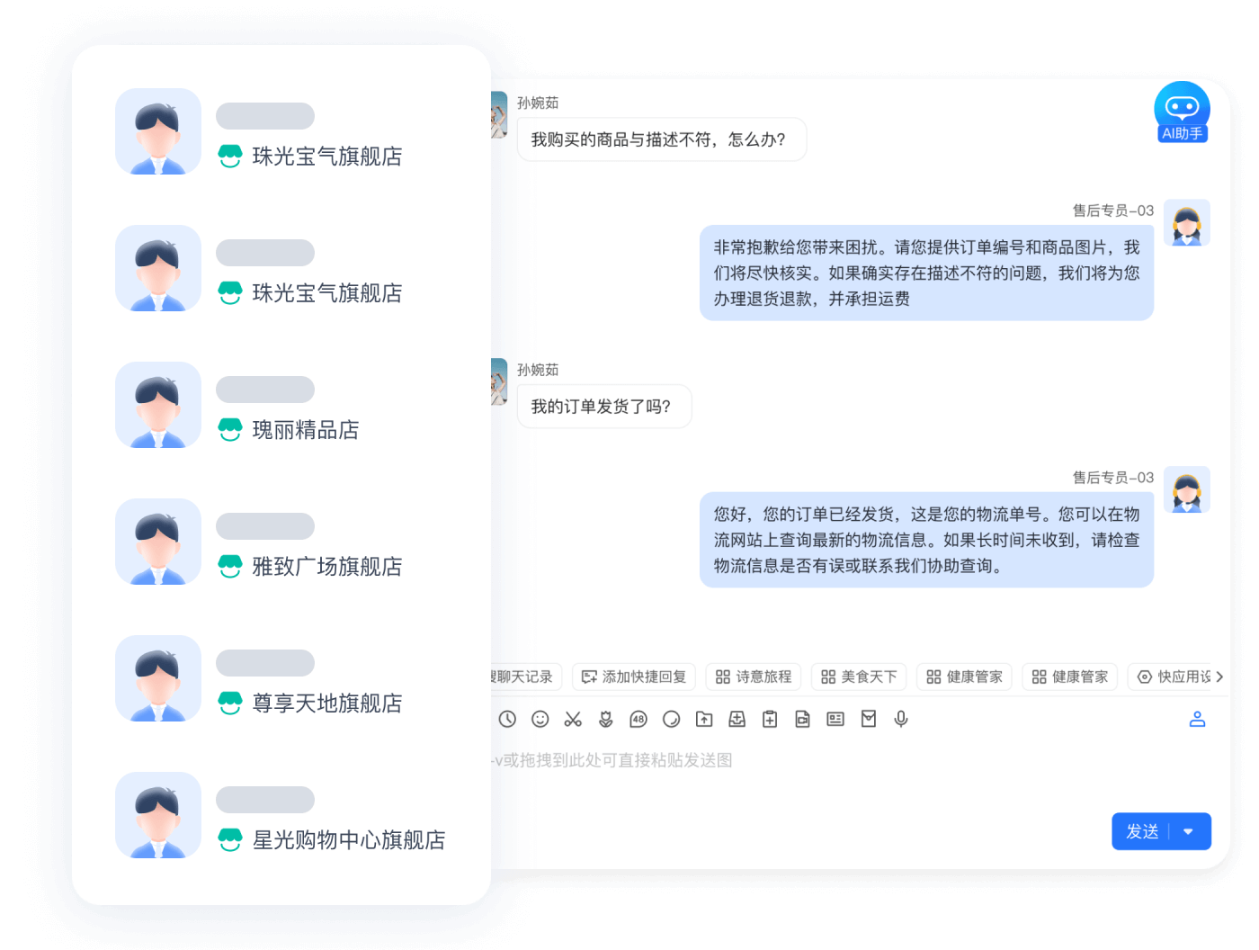 支持多店铺客户消息聚合管理,智能分配给多客服处理,实时查看客户售后订单,快捷、高效处理客户问题,提升用户满意度。