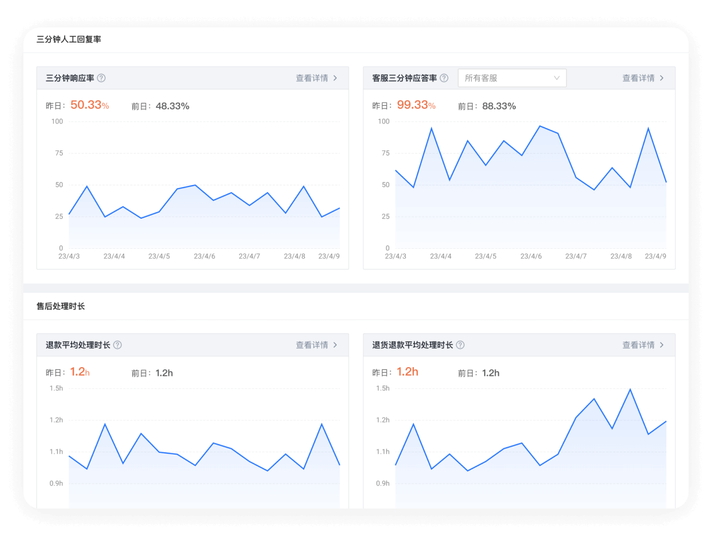 芝麻小店客服提供了丰富的数据统计,包括:接待超时统计、3分钟应答率统计、客服在线时长统计、首响超时报警统计、离线超时报警统计等,还支持推送报警消息,让管理员可以全面掌握客服动态,提升管理效率
